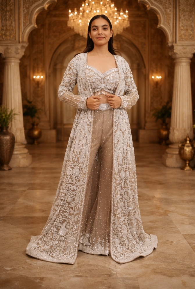 Make a statement with this Beige Net Indo Western Palazzo Set, perfect for luxury party wear. This three-piece set features a full-sleeve handwork jacket, a stylish bustier, and a flowing palazzo pant, all with intricate hand embroidery of sequins, pearls, stones, and pipe detailing. Crafted in lightweight net fabric, it ensures comfort and elegance for weddings, parties, or festive occasions. Side zipper and clip closures provide a perfect fit.