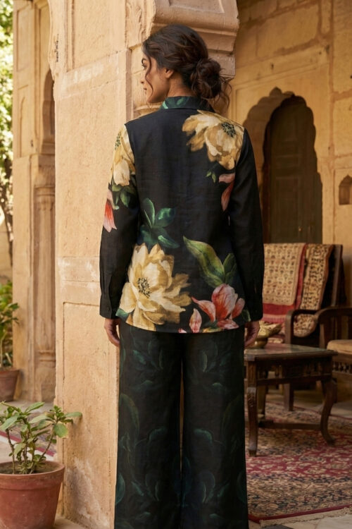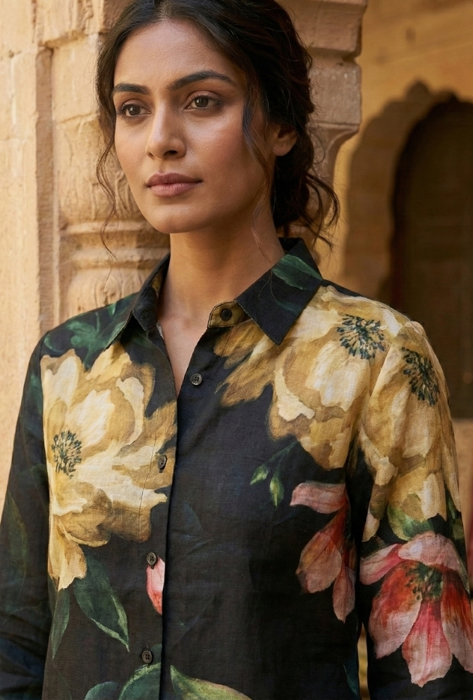 Top (Shirt): Printed shirt with relaxed fit, giving a modern Indo Western vibe.