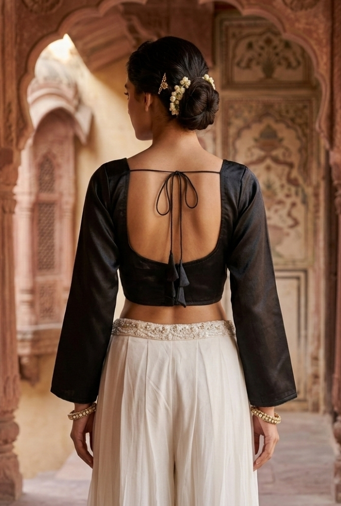 Embrace timeless elegance with this Black Satin Full Sleeve Blouse, a must-have staple for every wardrobe. Made from premium satin fabric, it offers a luxurious sheen and soft texture that complements any saree or lehenga. The V-neckline adds a touch of sophistication, while the padded design ensures a flattering, structured fit. Finished with a back hook and drawstring closure, this blouse blends comfort with effortless style — perfect for festive events, evening parties, or wedding occasions.