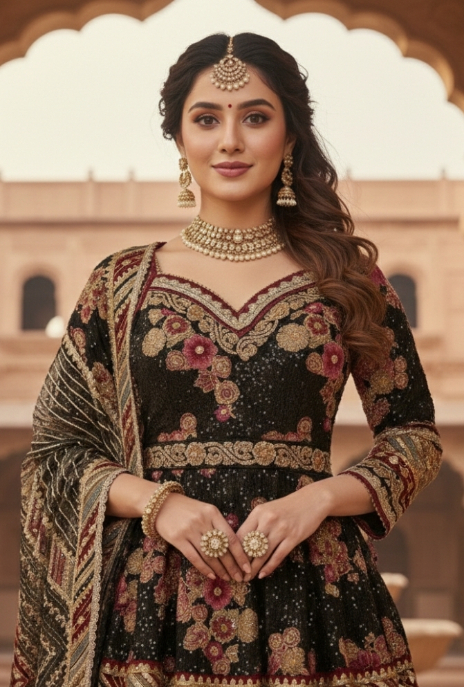 Make a royal statement with this black velvet lehenga choli set, beautifully embellished with floral embroidery and delicate handwork. The blouse features a unique neckline design with intricate detailing, paired with a heavily embroidered lehenga adorned with floral motifs and striking borders. The dupatta completes the ensemble with bold geometric patterns, cutwork edging, and heavy tassel accents, creating the perfect balance of tradition and modern elegance.