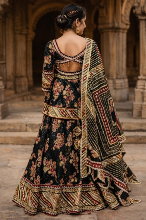 Black Net & Velvet Hand Embroidered Lehenga with Sequin Top & Dupatta