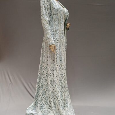 | Product Descriptions | Indo Western. Bustier in Jacket with Overall Handwork. Broad Border at Hem of Palazzo. |