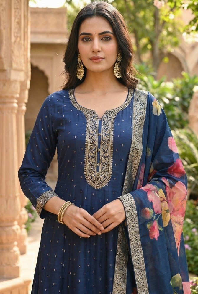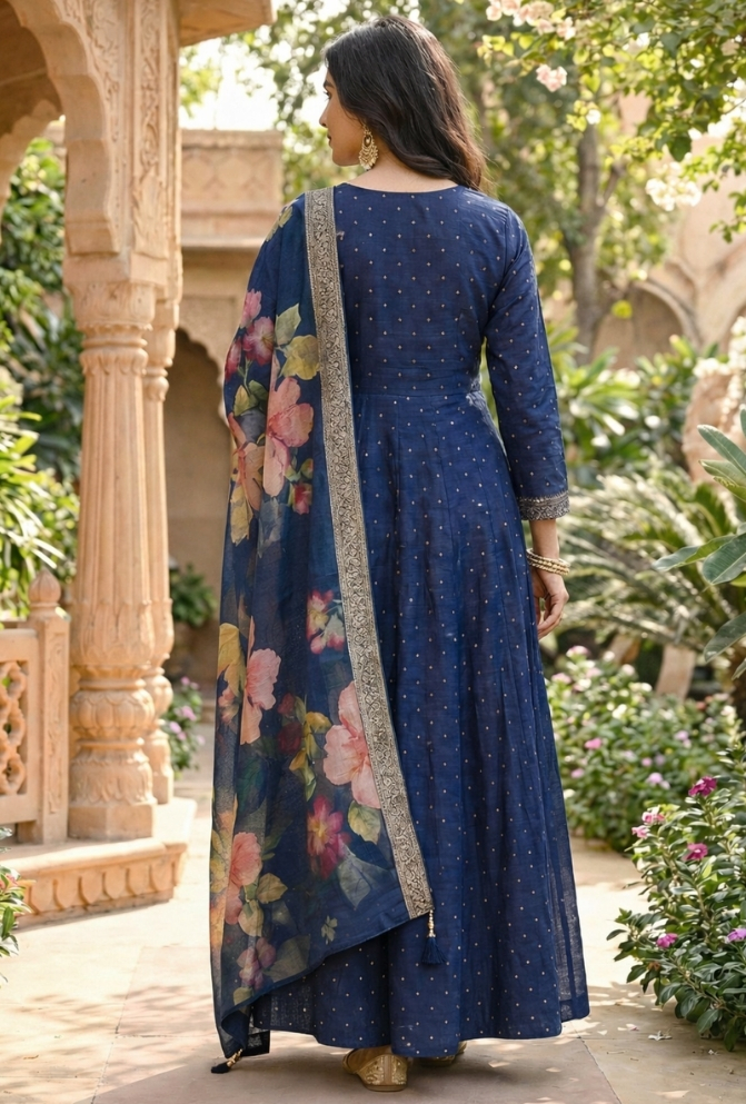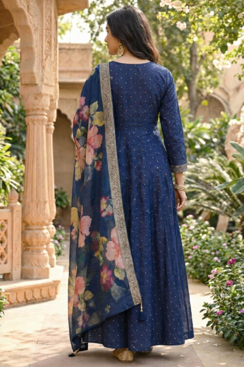 • Original Name : Nevy Blue Silk Anarkali Suit with Embroidery and Printed Dupatta