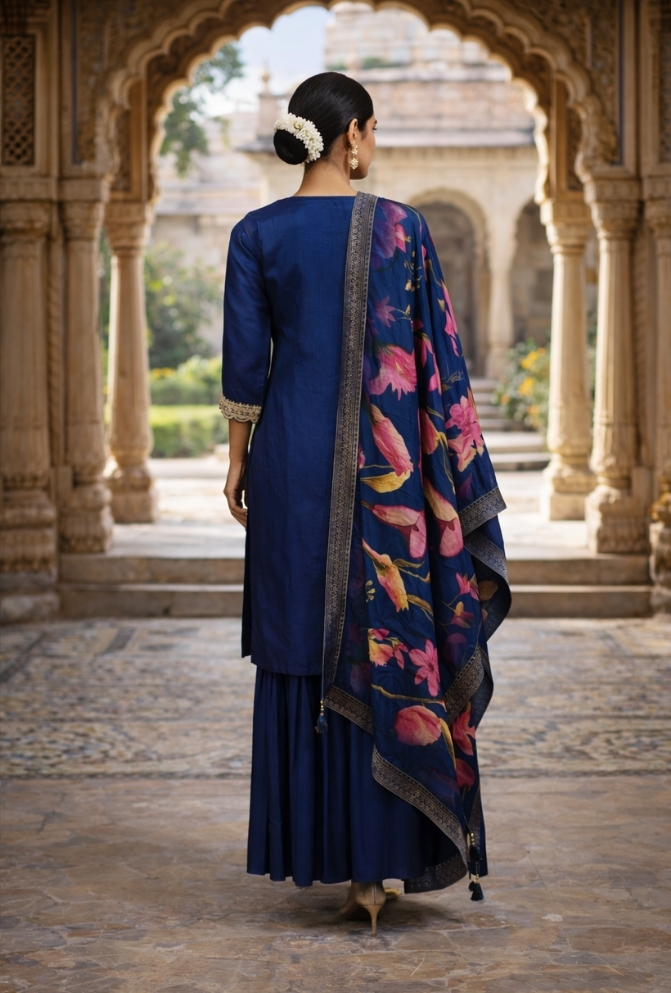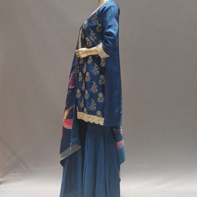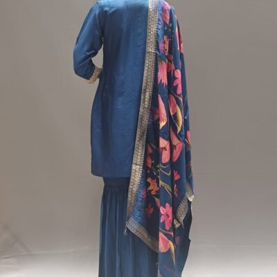 | Product Description | Sharara Top with work on front neck yoke and scallop border at hame with work plain sharara printed dupatta with tussels at four side |