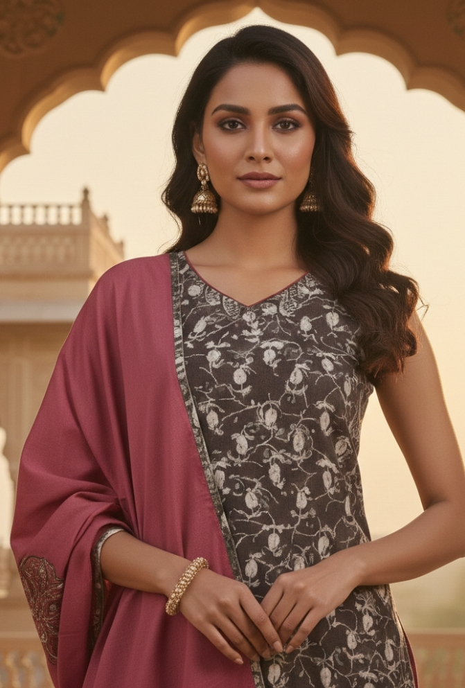 Upgrade your ethnic collection with this Maroon Cotton Batik Print Palazzo Suit Set. Made with breathable cotton fabric, this suit set is light, stylish, and perfect for daily as well as festive occasions.The kurta features hand embroidery with mirror work on the neckline, paired with a plain pant and a dupatta highlighted with a four-side border.This 3-piece set also includes unstitched sleeves attached, so you can customize as per your preference