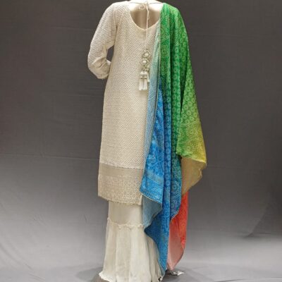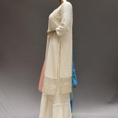 | Product Description | Lucknowi straight Kurti with hand embroidery at neck and Gota Patti work. Lace at Dupatta with plain Sharara/Plazo. |
