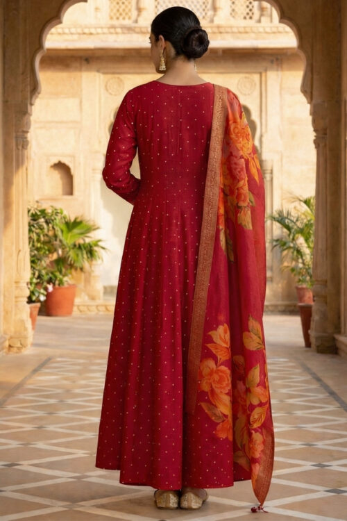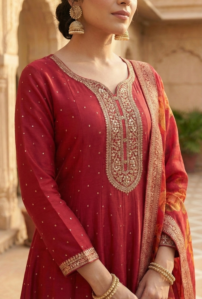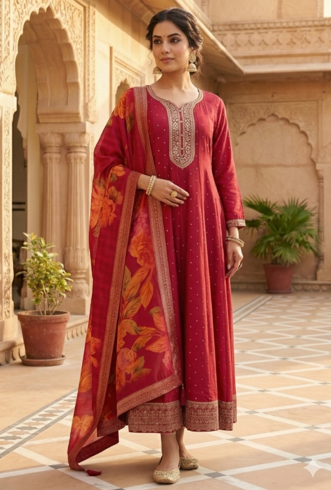 Make a graceful statement with this Rani Silk Handcrafted Anarkali Dress, a timeless addition to your festive and wedding wardrobe. The Anarkali kurti features detailed hand embroidery with sequins and Kasab on the front neckline and border, exuding royal charm.The look is completed with a beautiful printed dupatta, highlighted with a delicate self-work border and tassel finishing for an extra touch of elegance. Designed for comfort and grandeur, this outfit blends tradition with modern sophistication.