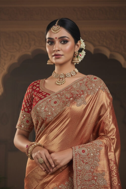 • Original Name : Gold Net Designer Saree with Attached Blouse – Party & Festive Wear