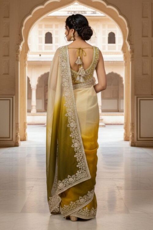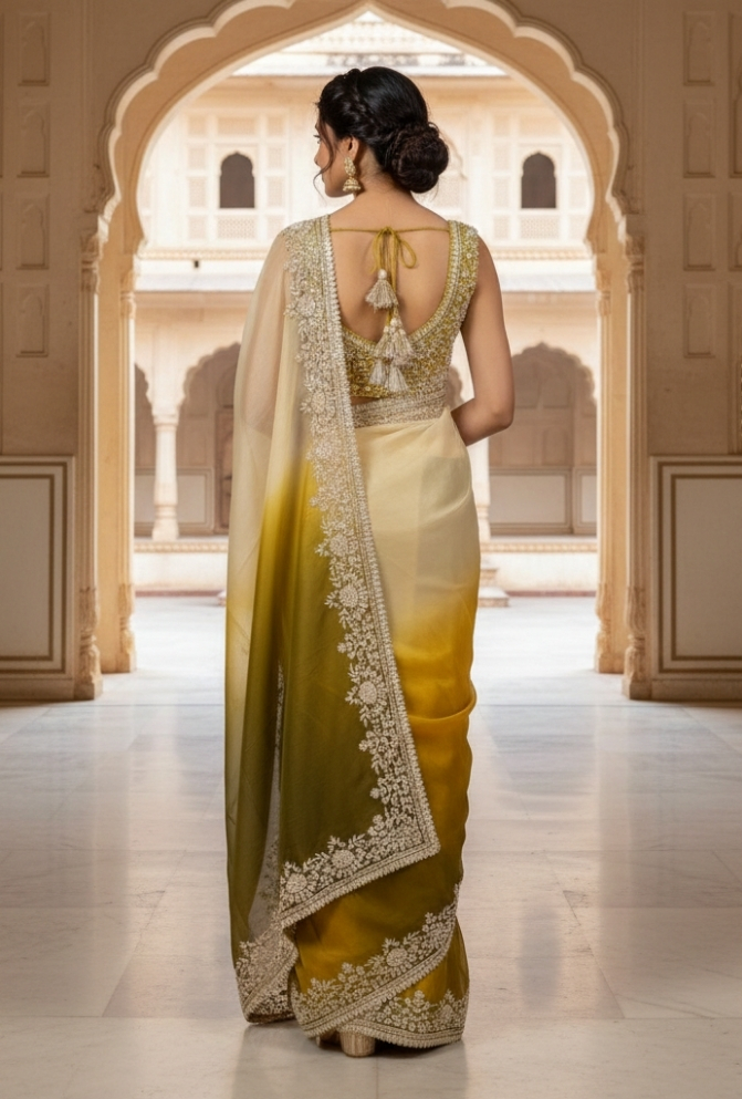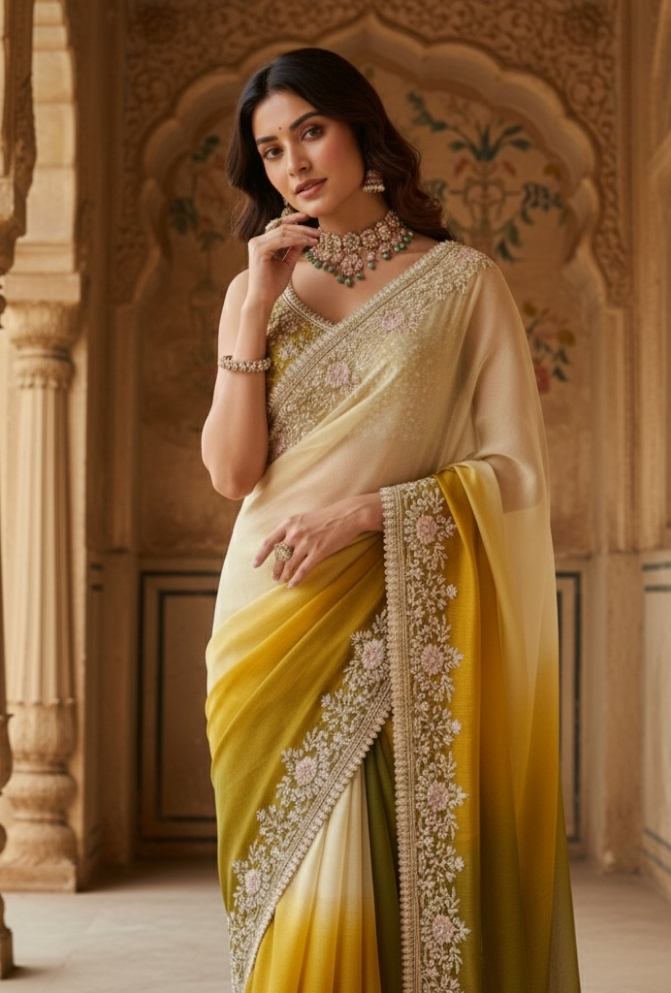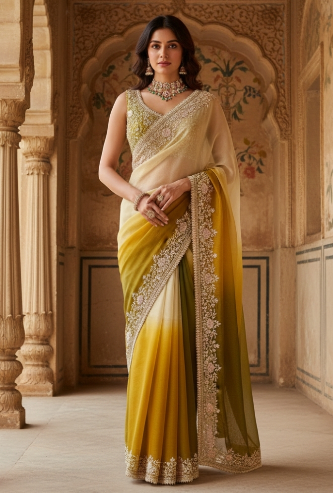 Original Name : Green & Off-White Shaded Organza Tissue Saree with Heavy Handwork Border