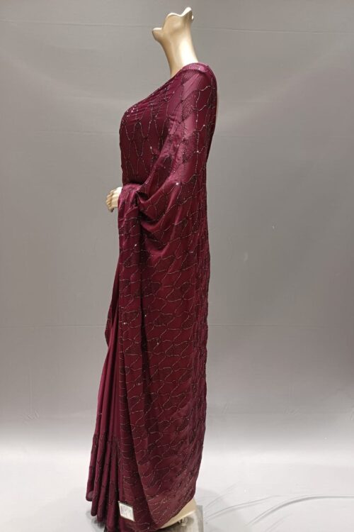 This saree comes with an attached unstitched blouse, allowing you to customize the fit as per your style. Embellished with sequins, beads, and pipe detailing, it radiates a luxurious sparkle, making it a must-have for evening wear.
