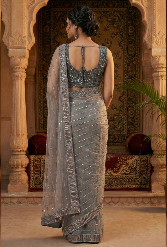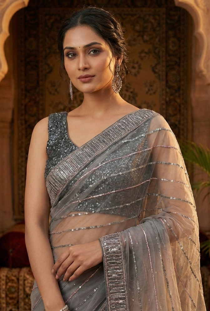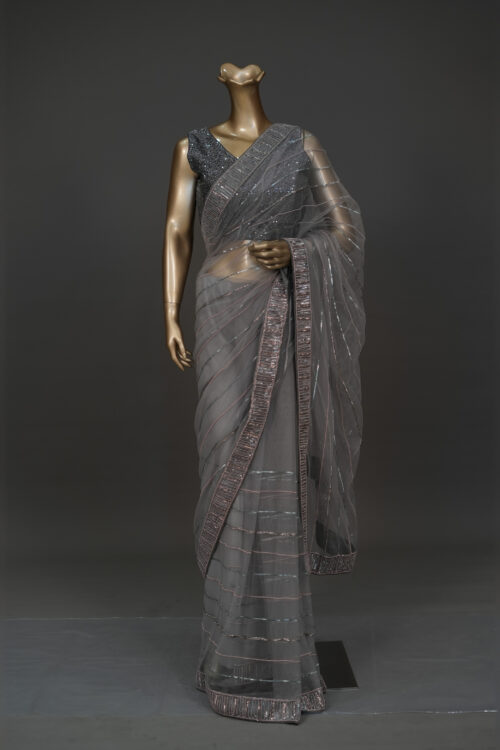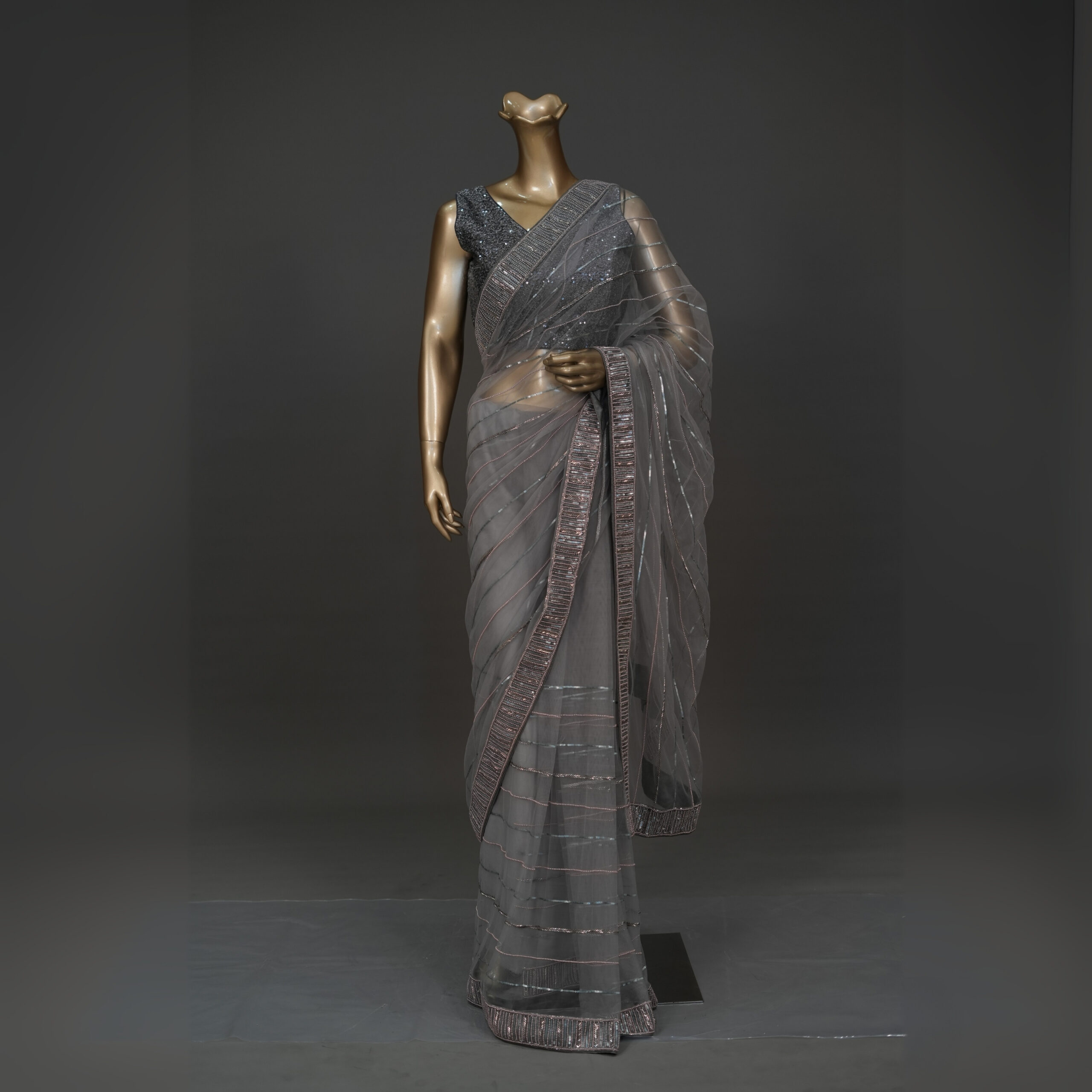 • Original Name : Grey Net Designer Saree with Attached Blouse – Party & Festive Wear