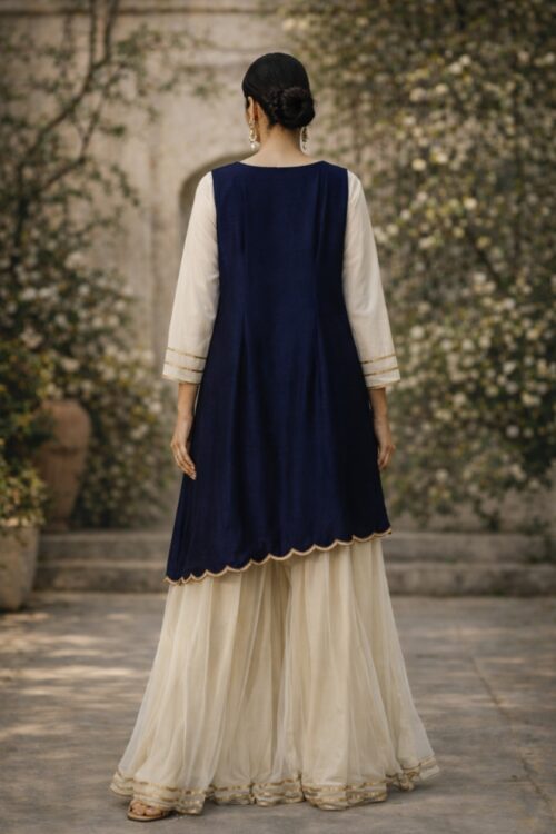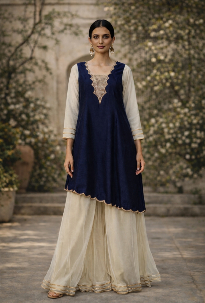 Turn heads this festive season with our Indo Western Palazzo Suit. Crafted in luxurious raw silk and net, this set combines tradition with modern chic. The blue asymmetrical top adds a contemporary edge, while the gold net palazzo brings in ethnic elegance.