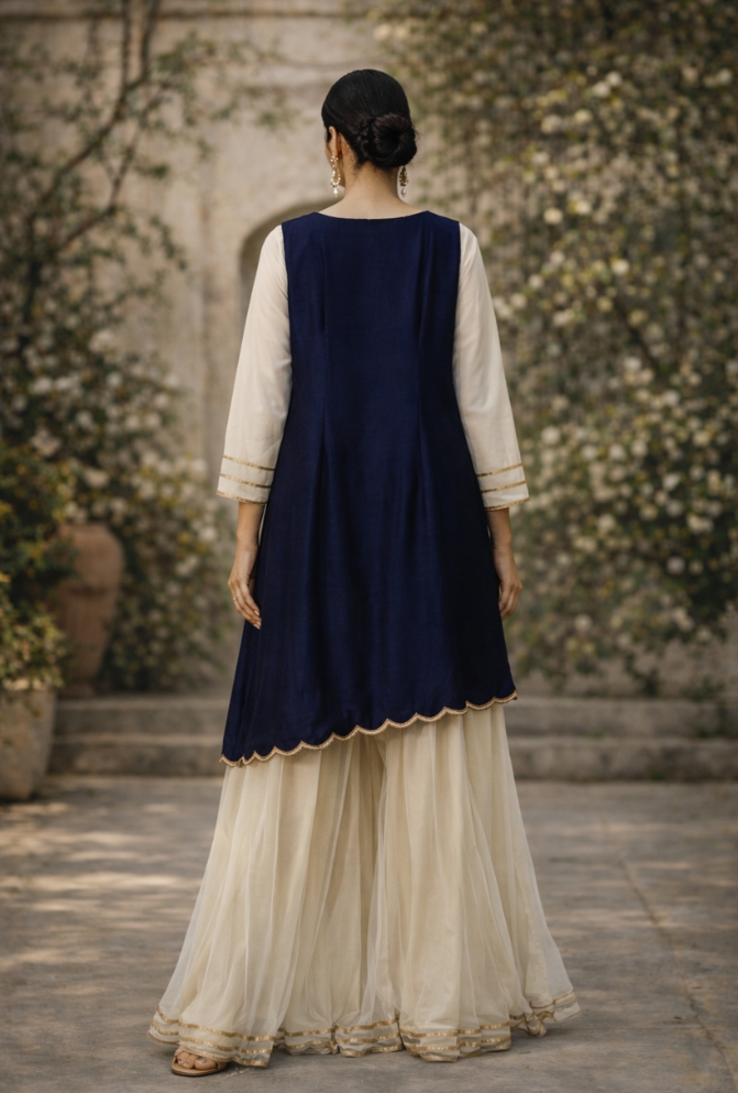 Indo Western Gold Net Palazzo with Blue Asymmetrical Top