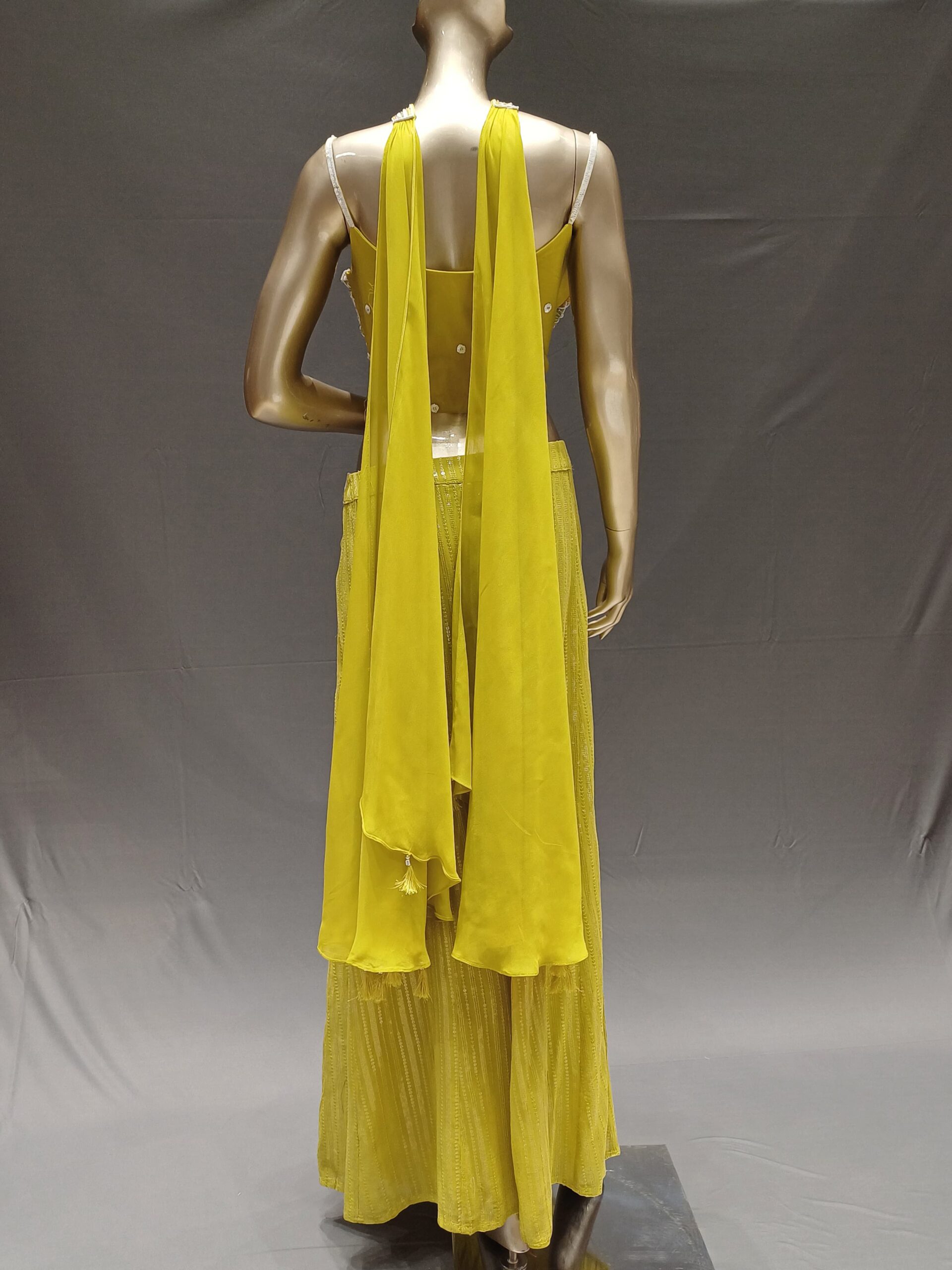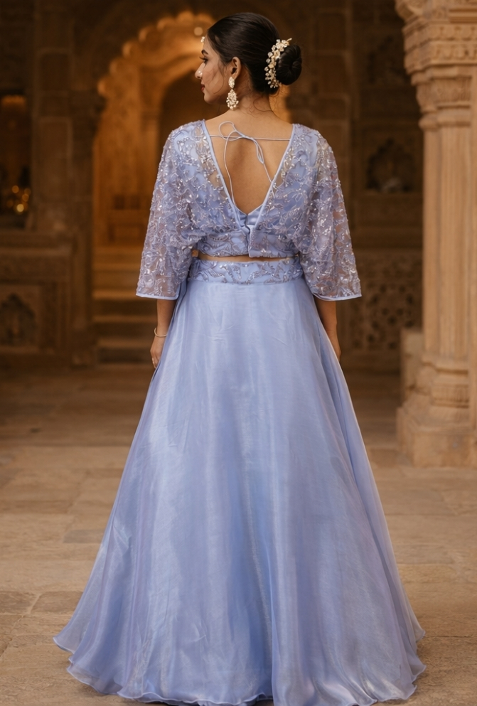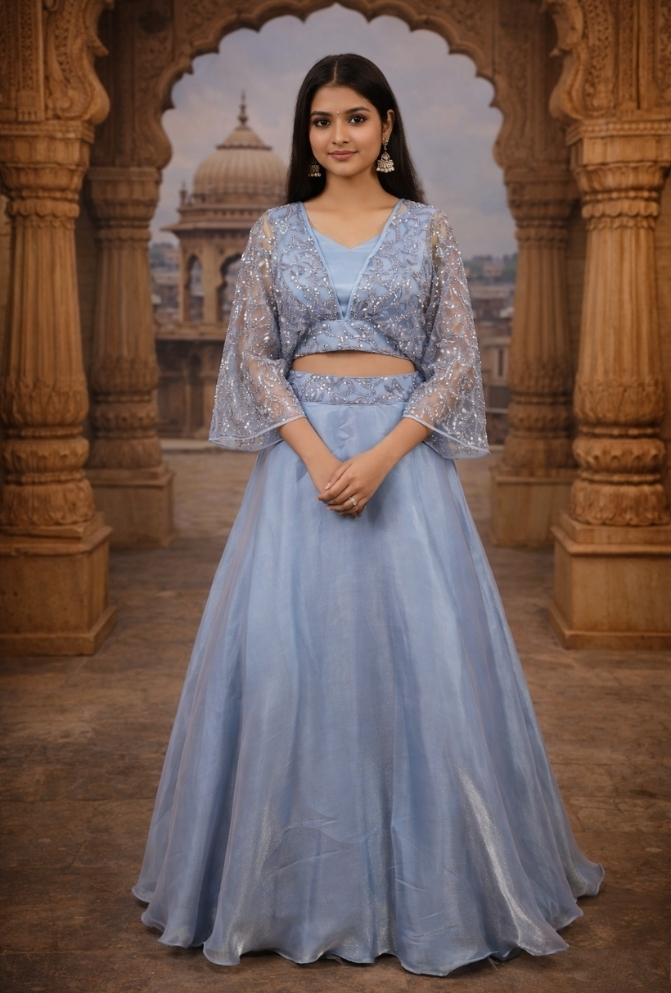 Make a statement with this Powder Blue Indo-Western Skirt Set, designed to blend elegance with modern charm. The crop top is adorned with delicate pearl and sequins embroidery and styled with graceful dolmen sleeves, giving it a refined appeal. It is paired with a glass tissue designer skirt, offering a rich silhouette and luxurious drape. Perfect for weddings, festive events, or evening parties, this ensemble brings a sophisticated twist to traditional wear.