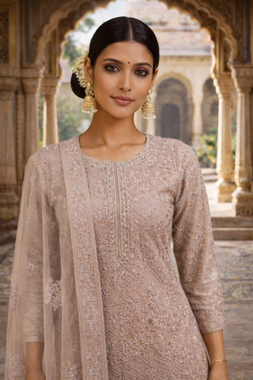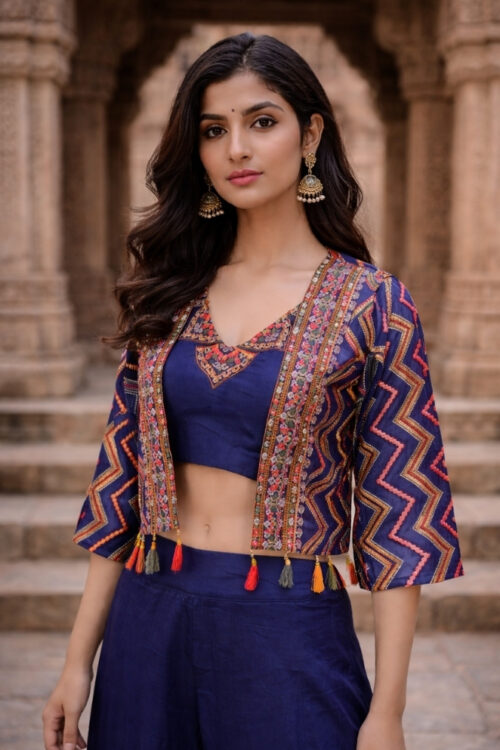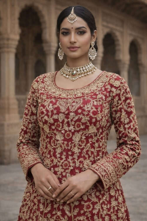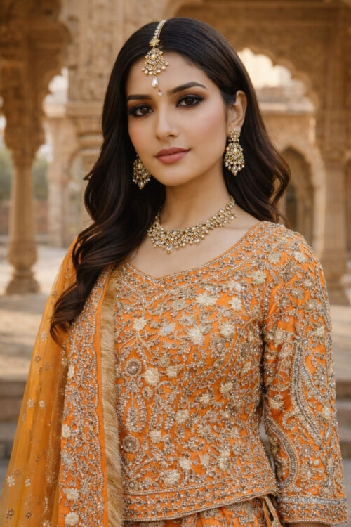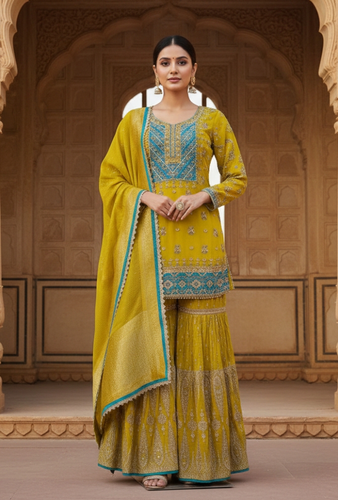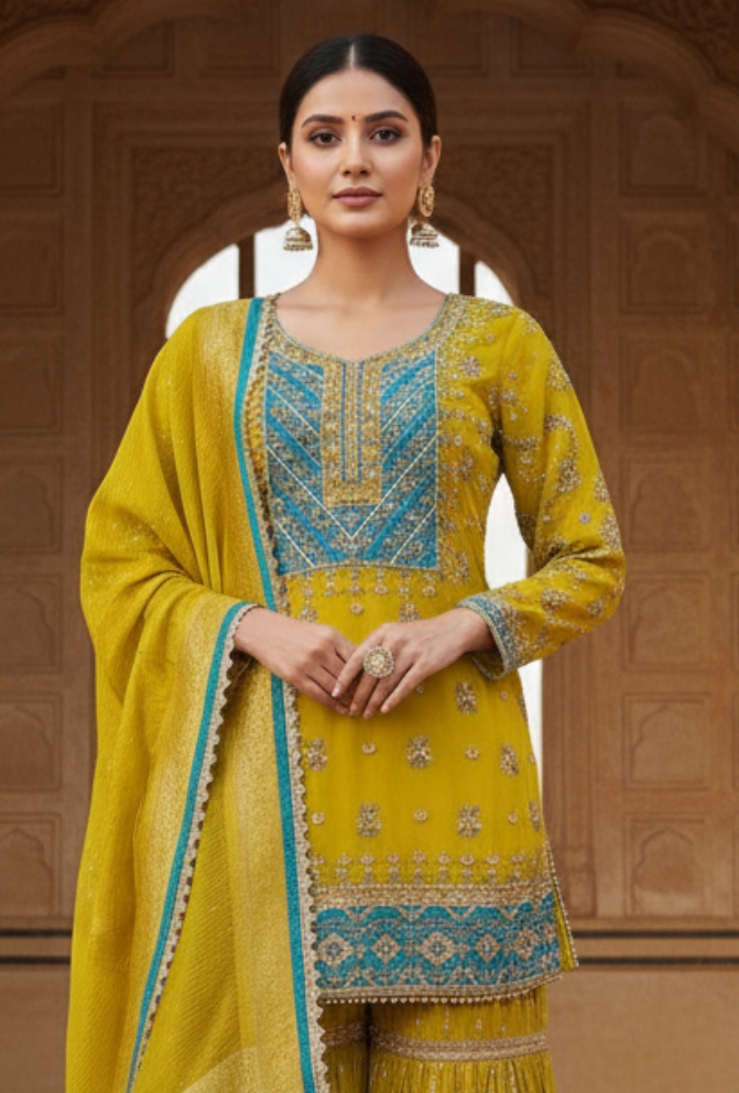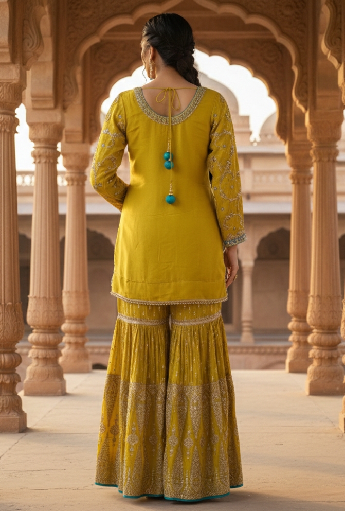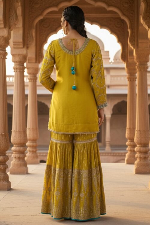 It comes with a heavily embroidered sharara finished with a detailed border at the hem and a stall-style dupatta with a four-side border. Perfect for Haldi, Mehendi, and festive functions, this outfit blends comfort and tradition effortlessly.