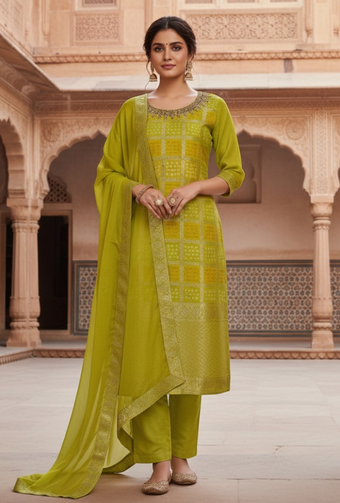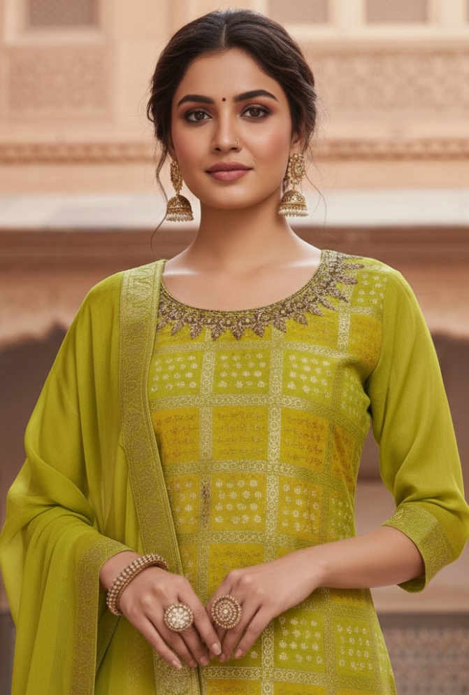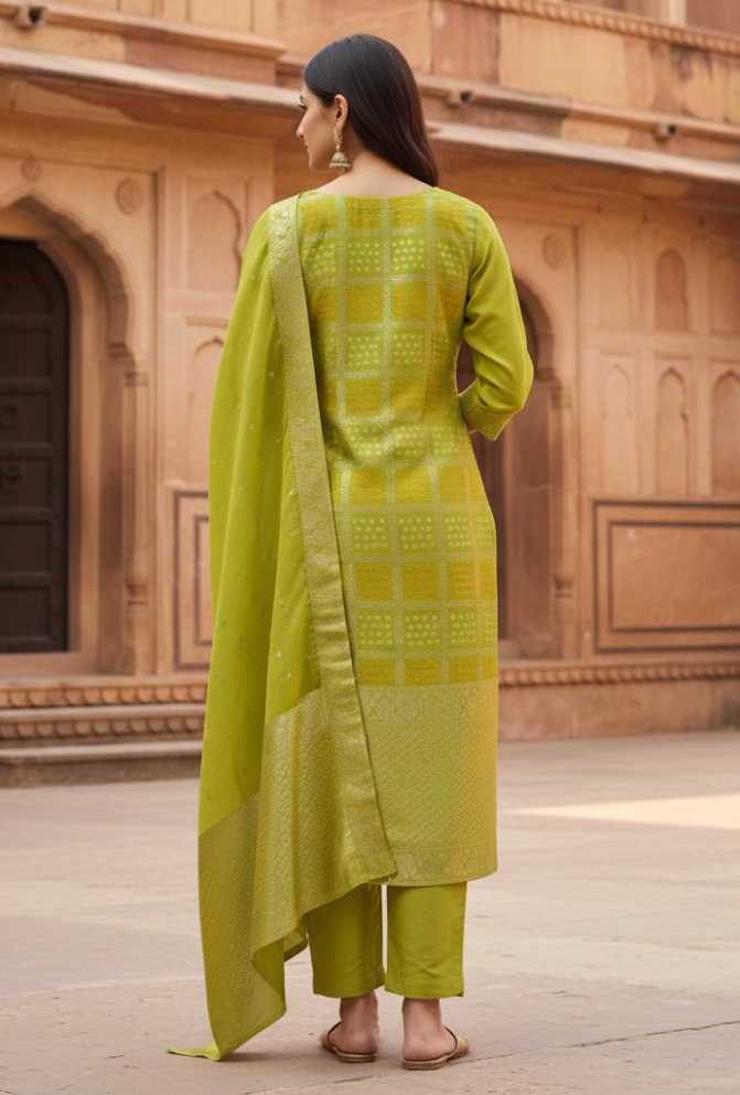 • Original Name : Parrot Green Banarasi Silk Suit Set with Hand Embroidered