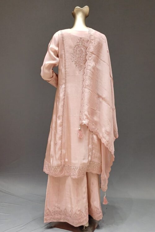 | Product Description | Dress shimar silk top with all over embroidery work and round flair with scallop border organza Dupatta with Fourside Scallop border and Tussels |