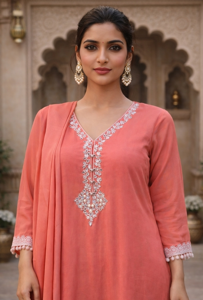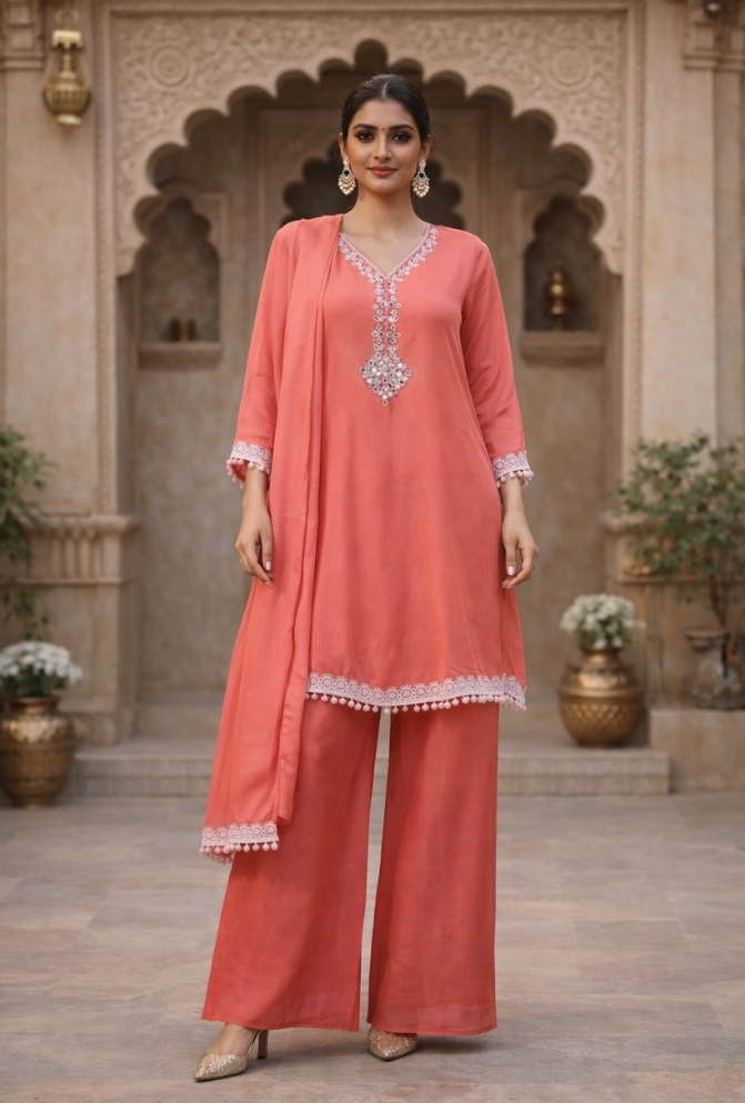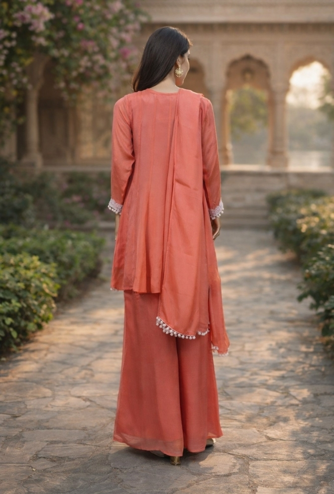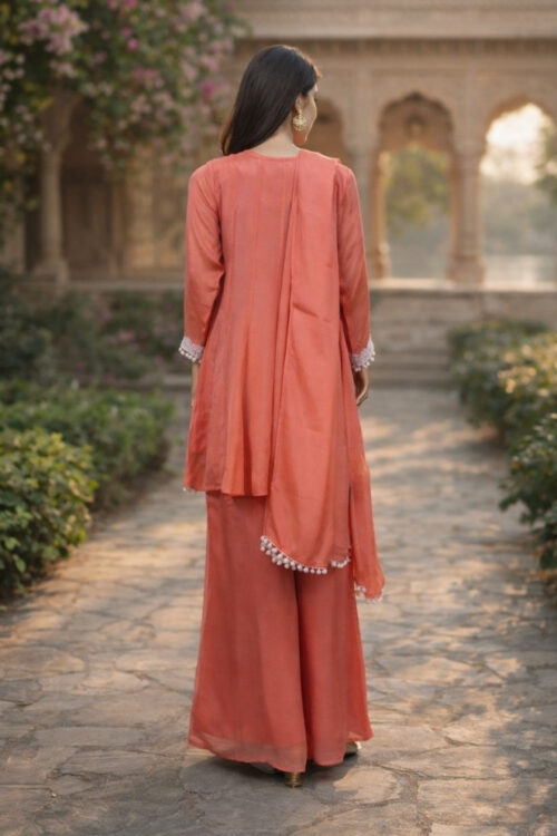 Bring grace to your festive look with this Peach Silk Palazzo Suit Set. The Anarkali-style top is decorated with mirror, pearl, sequins, and pipe handwork on the neckline, finished with a lace border at the hem. It comes with a plain palazzo for comfort and balance, and a matching dupatta enhanced with pom-pom lace on two sides, adding a playful charm to the outfit.