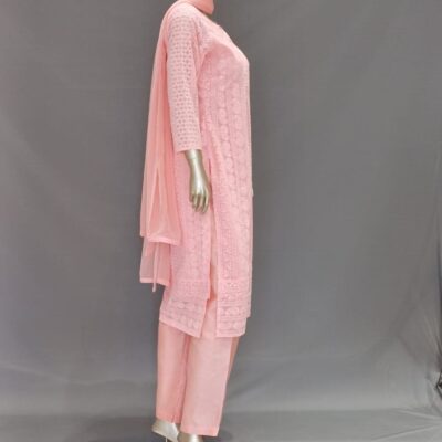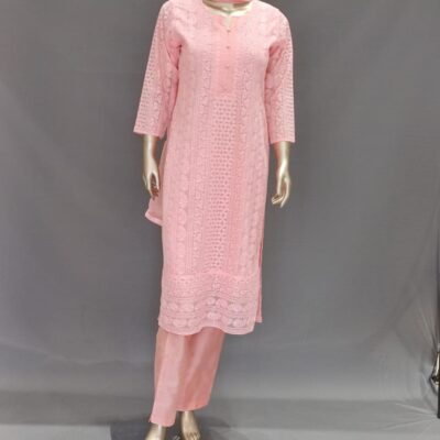 | Product Description | Round Neck with Lucknowi Chikankari work on top, Silk slub straight pants, Chiffon plain dupatta |