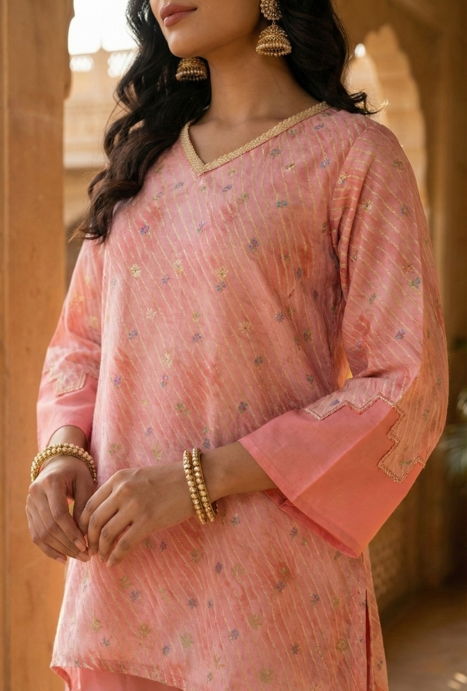 Step into sophistication with this Pink Silk Cord Set with Pearl Embellishment, a perfect blend of elegance and comfort. Designed in premium silk fabric, the outfit includes a printed top adorned with delicate pearl lace at the neckline and paired with a plain palazzo for a balanced look.