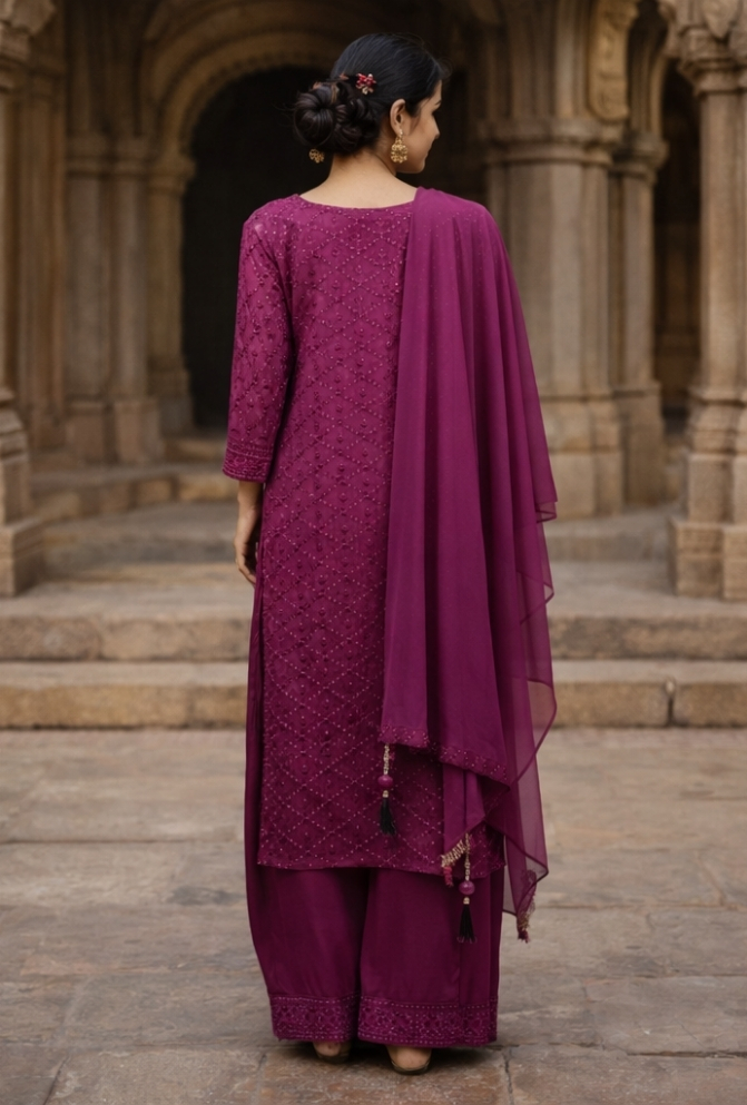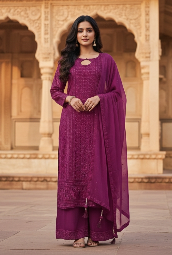 Brighten up your festive look with this Purple chiffon silk palazzo suit. The top is beautifully designed with all-over embroidery and sequin highlights, paired with a plain palazzo featuring an embroidered border. A lightweight dupatta with delicate tassels completes the elegant set. Perfect for weddings, festive celebrations, and special gatherings.