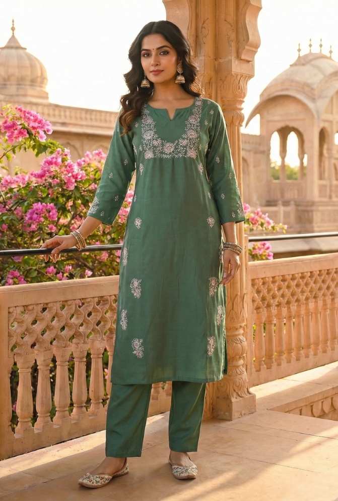 Add elegance to your wardrobe with this Green Silk Embroidered Suit Set. The silk kurta comes with delicate embroidery and handwork for a festive touch. Paired with a plain pant and a dupatta highlighted with embroidery, this outfit is perfect for celebrations.