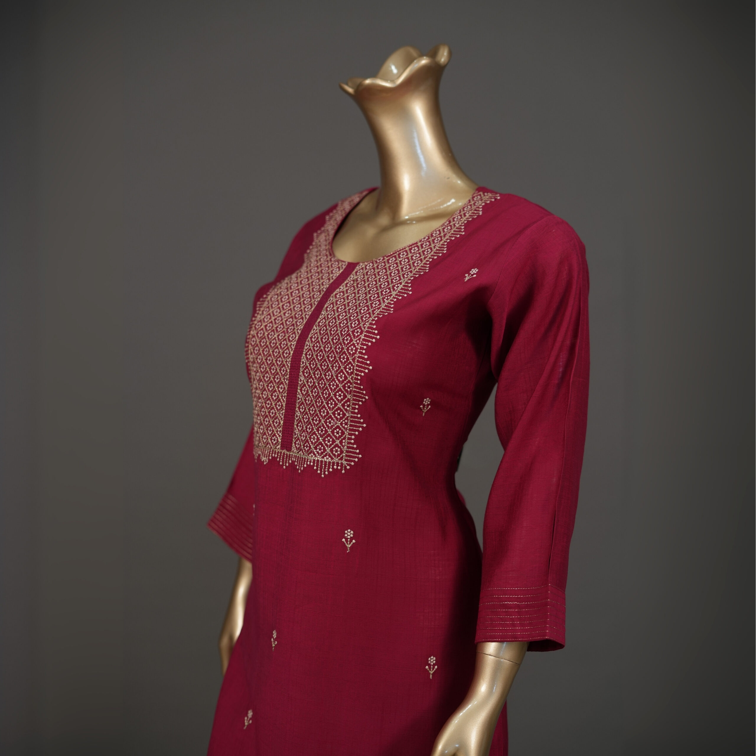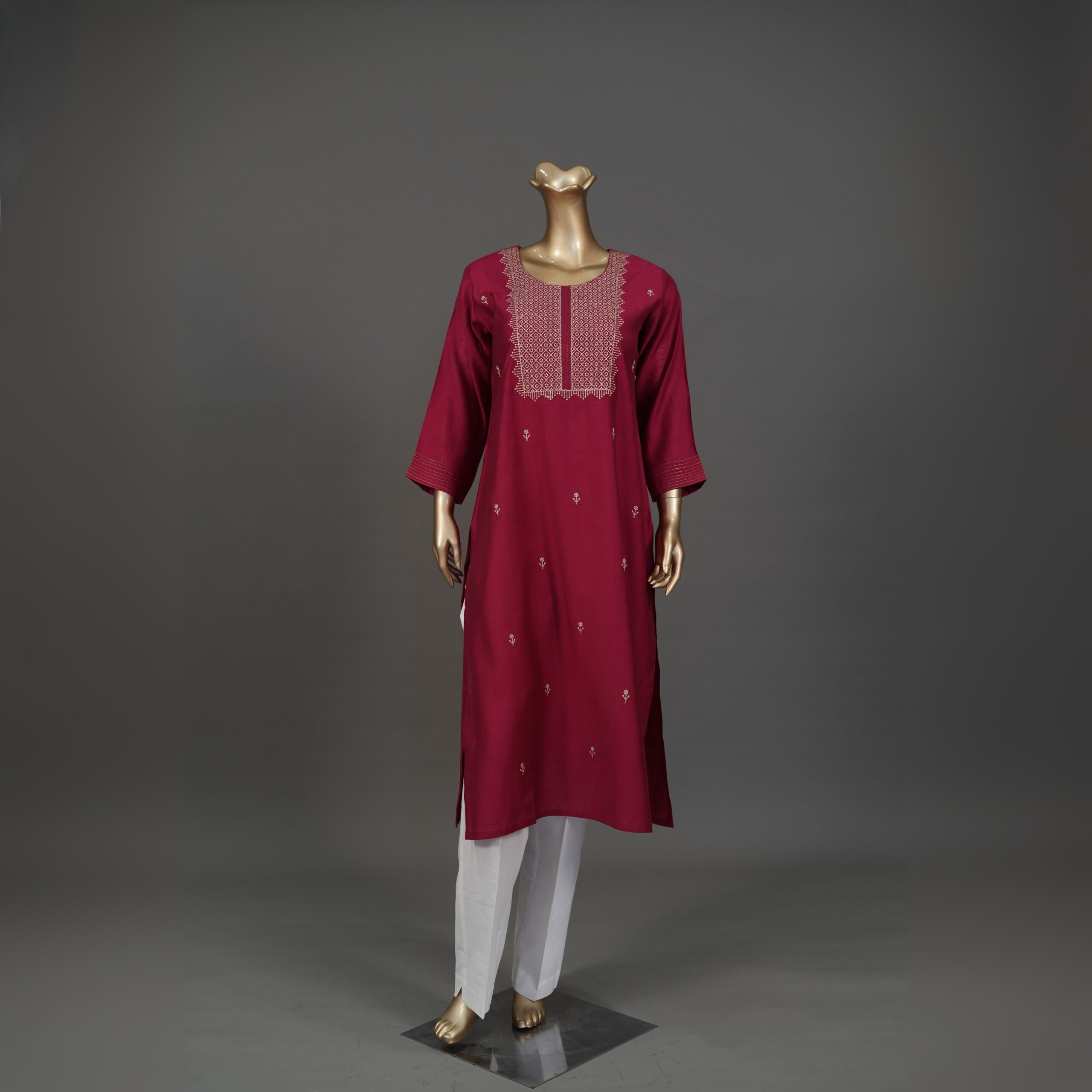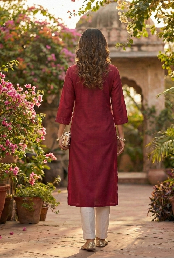 Elevate your ethnic wardrobe with this Rani Embroidered Silk Kurti, designed for women who love a traditional yet refined look. Made in premium silk fabric, this kurti features intricate embroidery on the neckline along with delicate butti work all over.