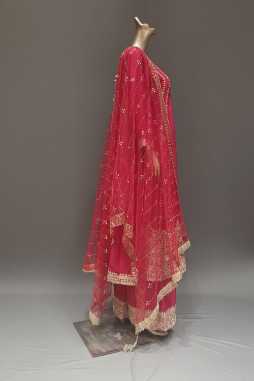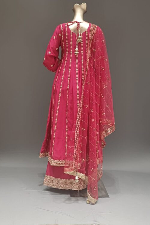 | Product Description | Anarkali Suit Top With Heavy Work on neck with Broad Daman border also on sleeve Round Plain Plazzo With Broad Border in Round Net Dupatta all over Embroidery With gotapati lace on 2 side border |