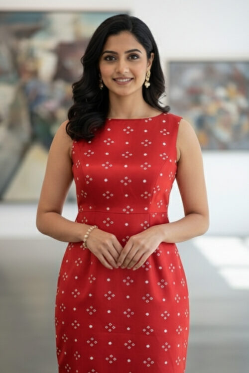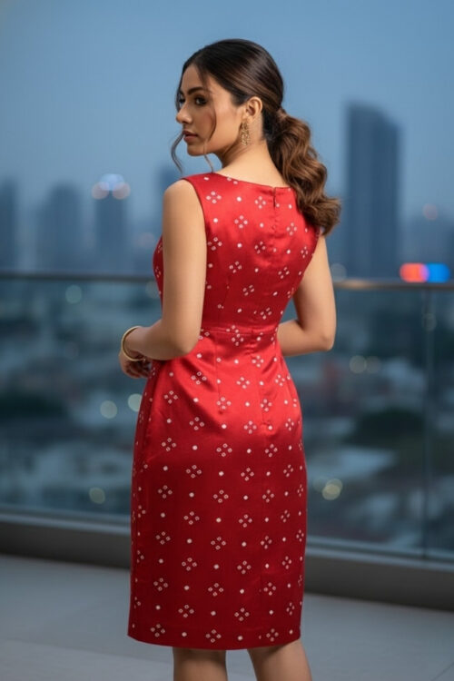 This Red Bandhej Gaji Silk Midi Dress brings together traditional print and modern style. Made from soft Gaji silk fabric, it features a beautiful Bandhej pattern that adds a festive touch. The midi length gives it a smart and elegant look, while the back side zipper closure ensures a proper and comfortable fit. Perfect for women who love ethnic prints in a contemporary style.