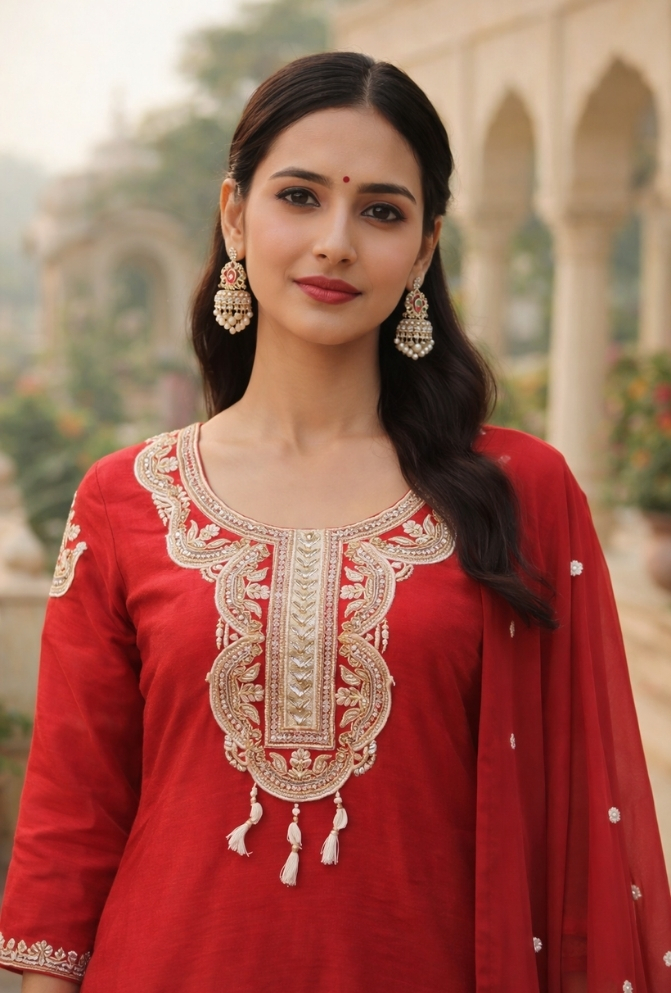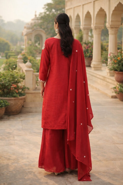 Add elegance to your festive look with this Red Raw Silk Palazzo Suit Set. The kurta features 100% hand embroidery on the front yoke with a round neckline, designed using zardosi, resham, sequins, pipe, and beadwork. It is paired with a plain palazzo for a graceful flow and a matching dupatta with butti work and tassels for a complete festive touch.