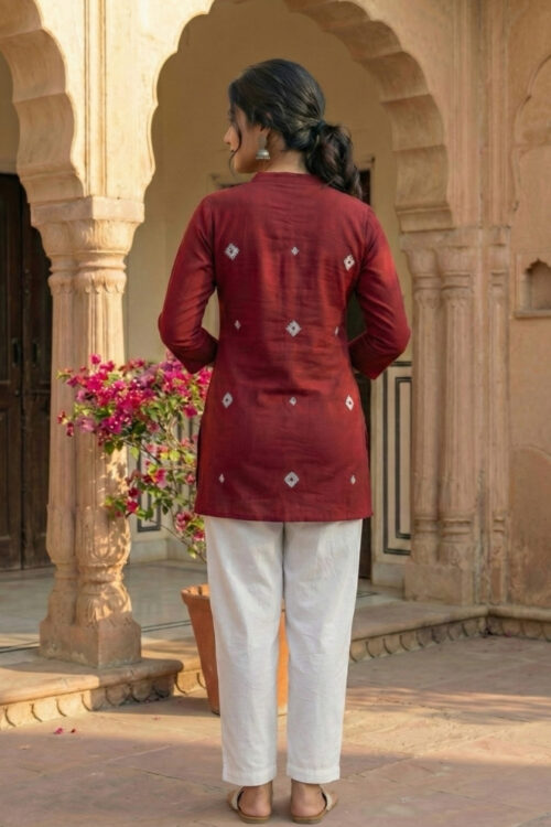 Add a touch of traditional elegance to your casual wardrobe with this Red Rayon Bandhej Short Kurti. Designed with pleated detailing on the neckline and stylish buttons, this kurti offers both comfort and style. Made from breathable rayon fabric, it ensures ease of movement while keeping the ethnic vibe intact. Perfect for college wear, daily casuals, or festive gatherings, this kurti pairs well with leggings, palazzos, or jeans.