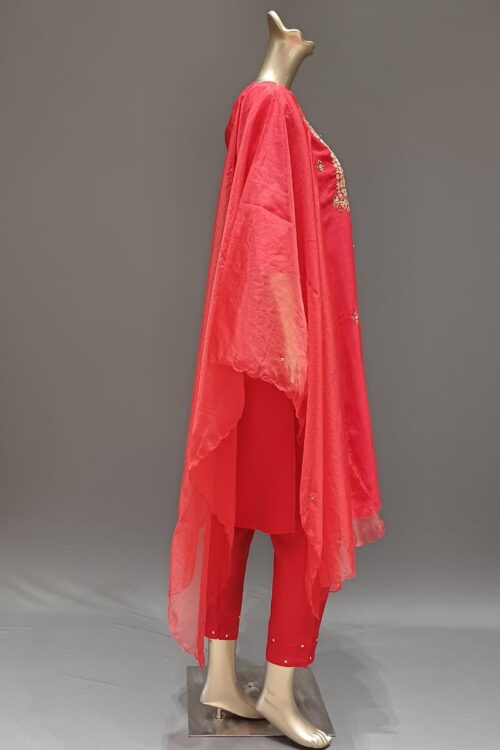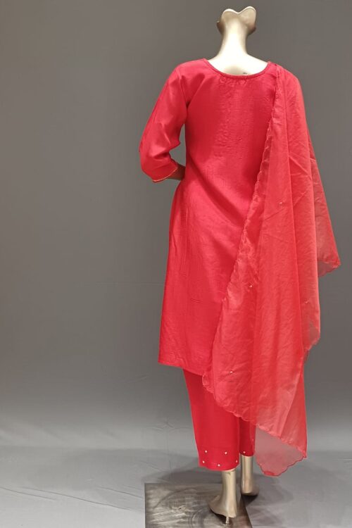 | Product discription | Dress. Handwork in Top front Neck with all over buttis , plain pant with work in bottom hem, Duptta with scalloped all over organza |