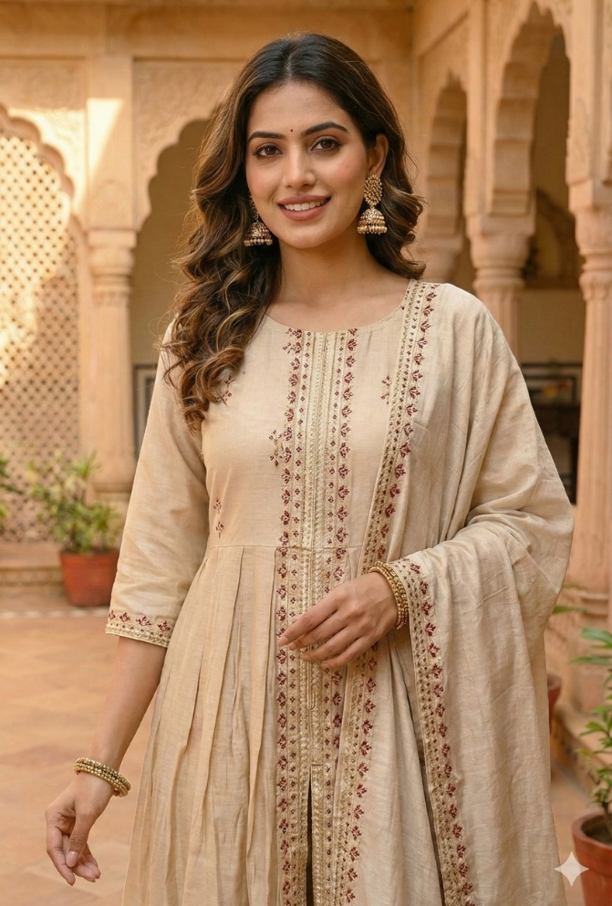 This Ivory Silk Anarkali Suit Set is a perfect choice for festivals and special occasions. The Anarkali top is decorated with embroidery and sequins, paired with a matching pant and dupatta with embroidery on both sides Borders. Comfortable and stylish, this outfit blends traditional elegance with modern charm.