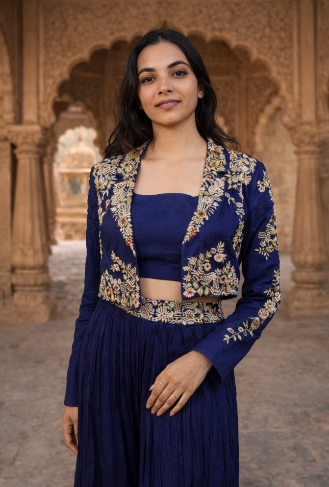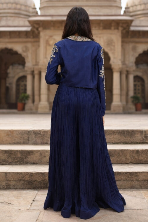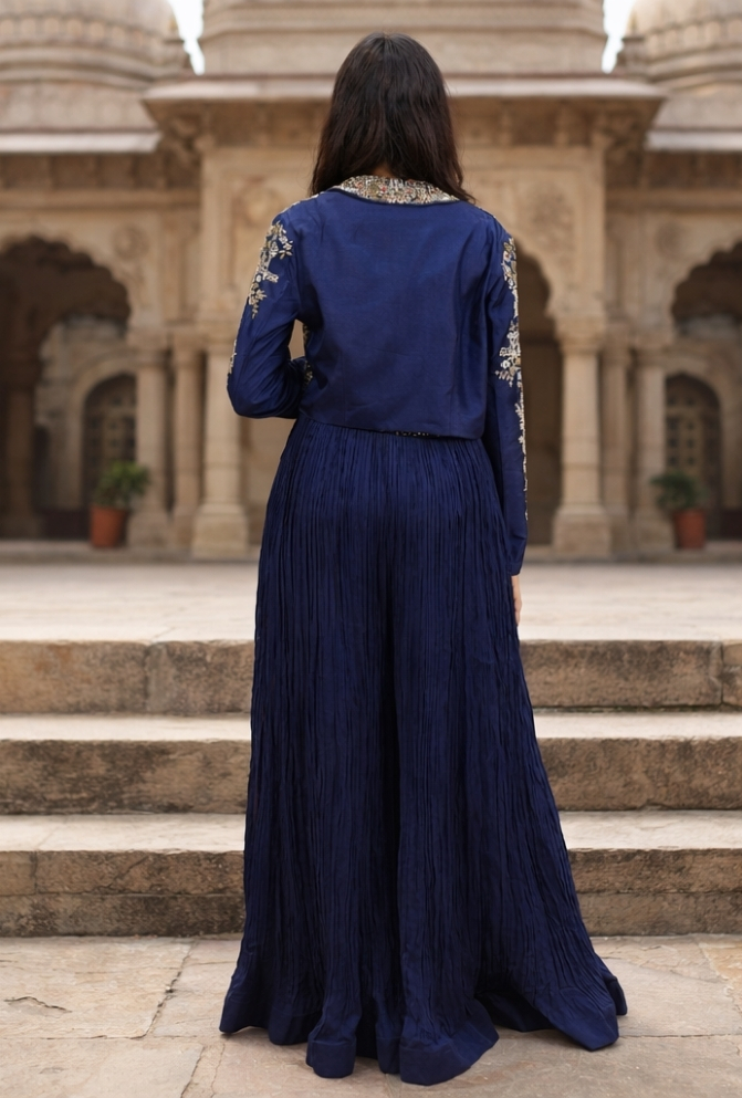 Elevate your festive look with this Royal Blue Indo Western Crop Top Set, crafted in luxurious silk and crush fabric. The set includes a spaghetti crop top, a richly hand-embroidered jacket, and a stylish belted palazzo. Intricate zardosi, resham, pearl, and tiki handwork add richness and grandeur, making this outfit perfect for weddings, receptions, and high-profile festive celebrations. The fusion of ethnic craftsmanship and modern cuts makes this set a must-have for women who love elegance with a contemporary twist.