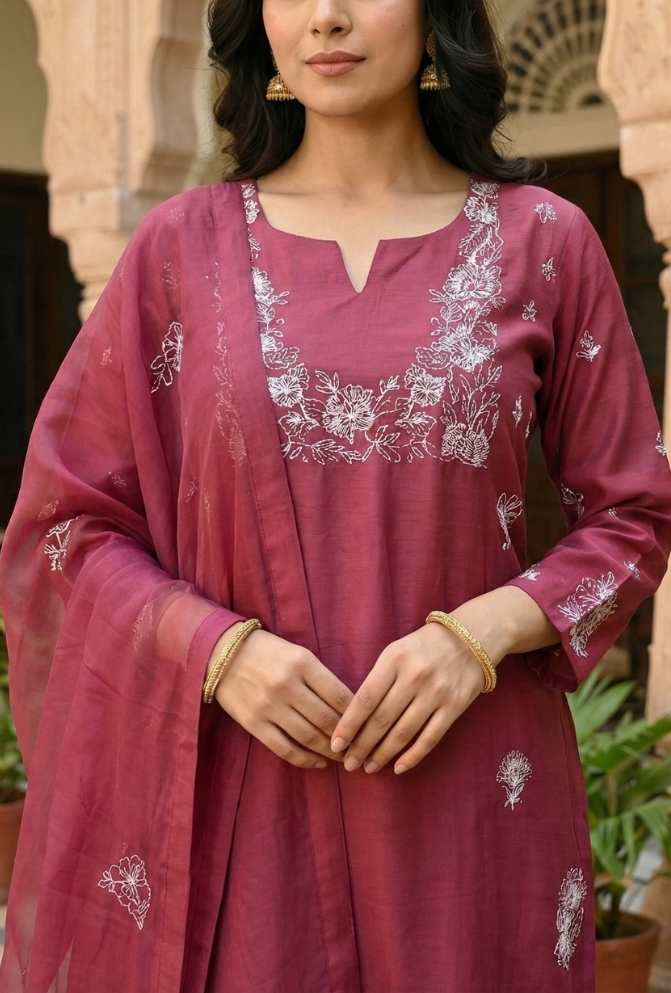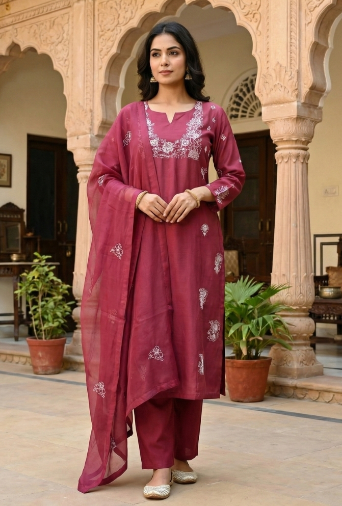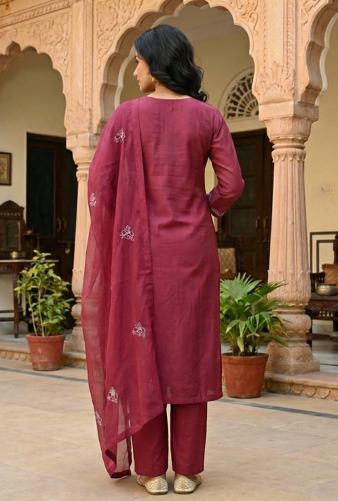 Add elegance to your wardrobe with this Maroon Silk Embroidered Suit Set. The silk kurta comes with delicate embroidery and handwork for a festive touch. Paired with a plain pant and a dupatta highlighted with embroidery, this outfit is perfect for celebrations.