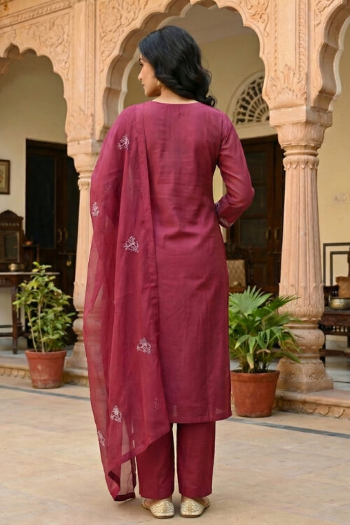 • Original Name : Maroon Silk Embroidered Suit with Pant & Dupatta
