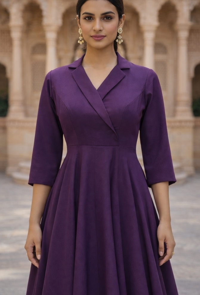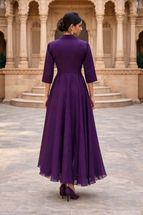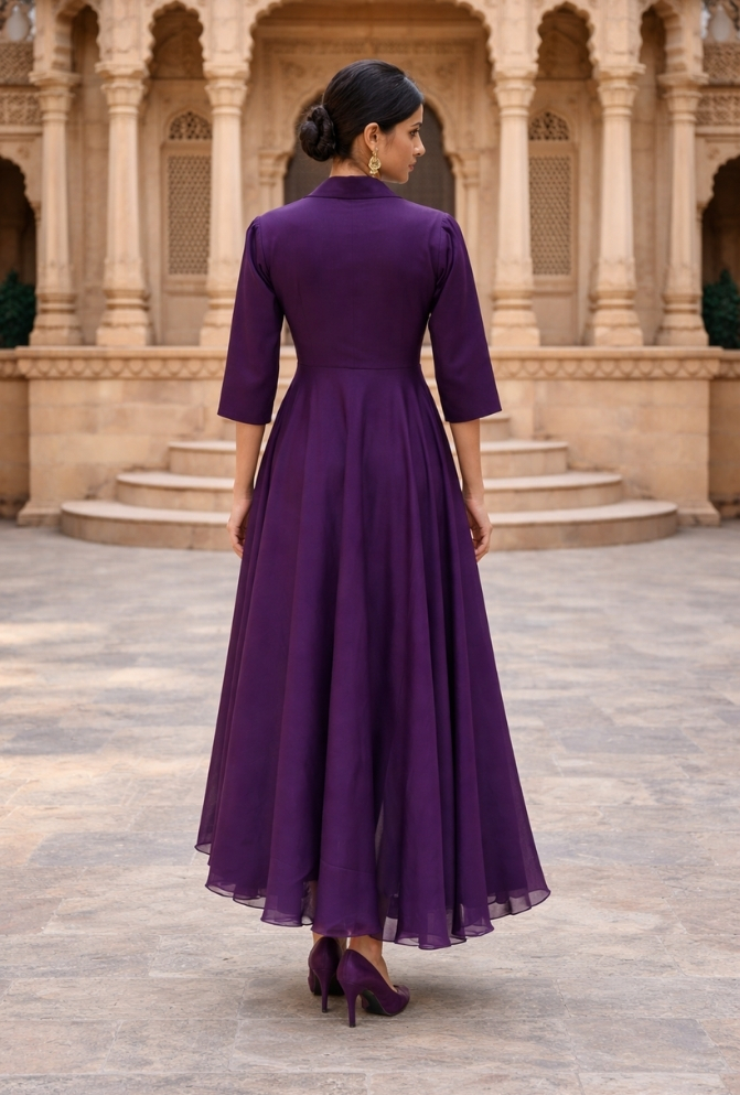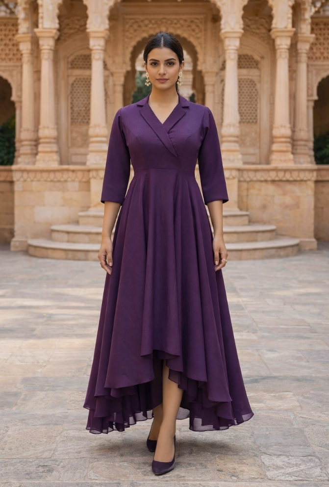 This Violet Shimmer Georgette Maxi Dress features a stylish asymmetrical pattern with a blazer collar, giving it a smart and modern look. Made from soft shimmer georgette, it has a light shine perfect for parties. Designed with 3/4 sleeves and a side zipper closure, it offers both comfort and a neat fit. A great choice for party nights and special events.