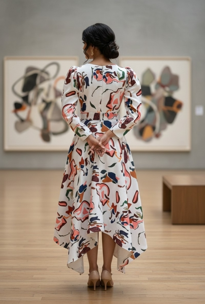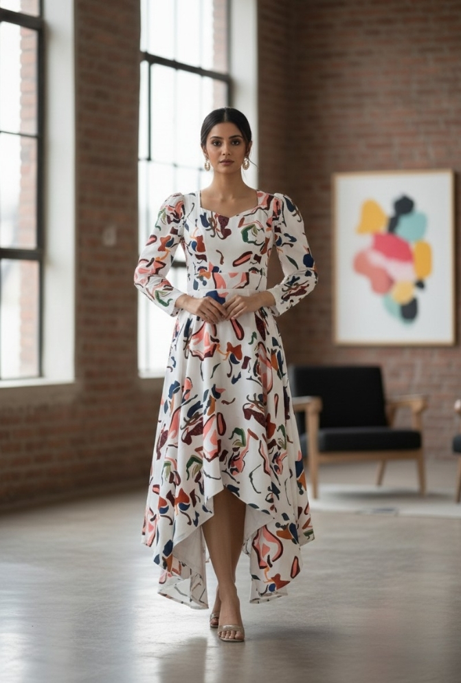 This White Multi Abstract Print Dress is designed for a stylish and modern look. Made from smooth satin fabric, it gives a soft shine and comfortable feel. The dress features a beautiful abstract print, elegant full sleeves, and a back side zipper closure for a proper fit. Perfect for parties, dinners, or special outings, this satin dress adds a fresh and classy touch to your wardrobe.