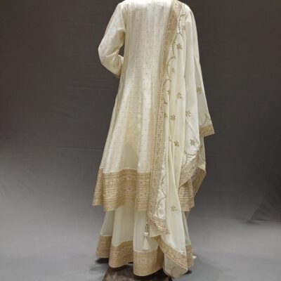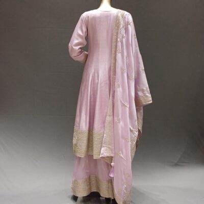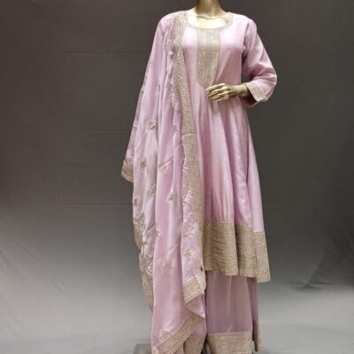| Product Description | Anarkali dress with handwork at front neck & bottom and broad border in palazzo at bottom. All-over border dupatta with tassels. |