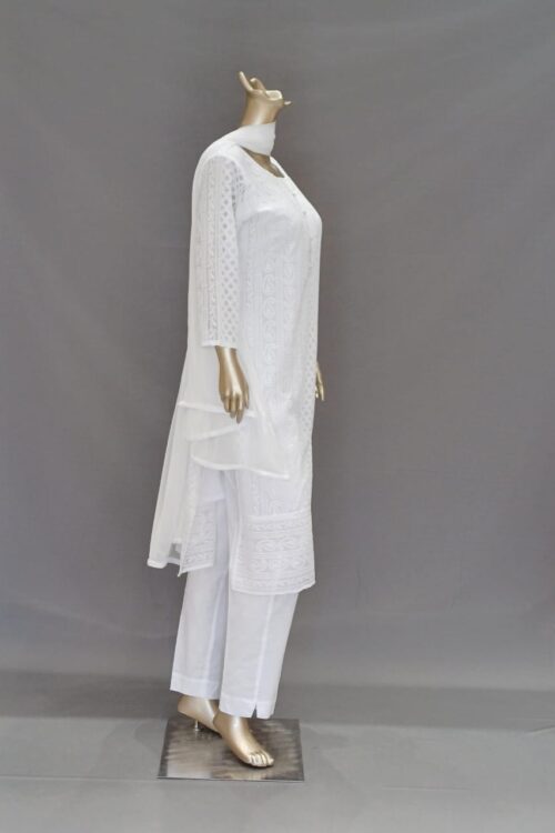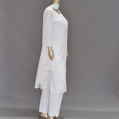 | Product Description | Round Neck with Lucknowi Chikankari work on top, Silk slub straight pants, Chiffon plain dupatta |