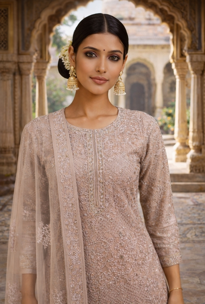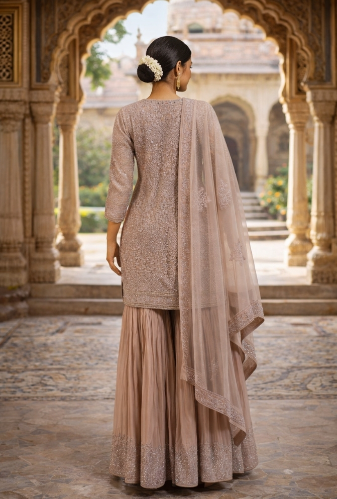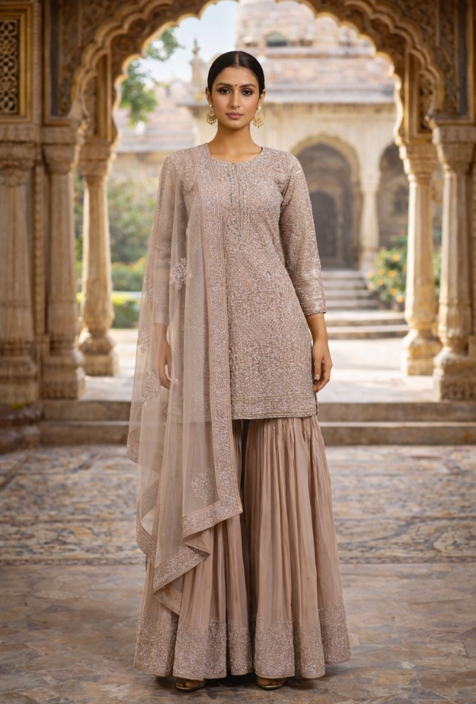 This Designer Sharara Set in Pink georgette brings together traditional elegance and modern style. The top is decorated with all-over embroidery and mirror, kasab, stone, and diamond handwork, making it a statement festive outfit. The sharara features detailed work at the hem, while the net dupatta with a heavy embroidered border adds a graceful finish.